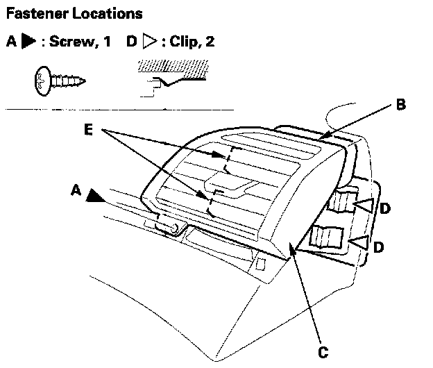 2. Remove the screw (A). Then gently press up on the passenger's side vent (B) from the outer bottom edge (C) toward the inside of the car to release the outer side clips (D). While gently pressing up on the passenger's side vent, pry it toward the door opening to release the tabs (E).
