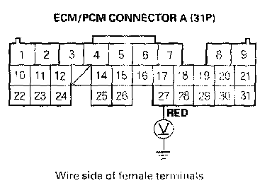 13. Using the backprobe set, measure the voltage between the No.27 terminal of ECM/PCM connector A (31P) and body ground with the ECM/PCM connectors connected.