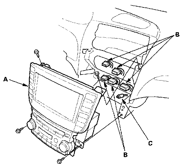4. Disconnect the connectors (B) and antenna lead (C), then remove the audio-HVAC display module assembly.