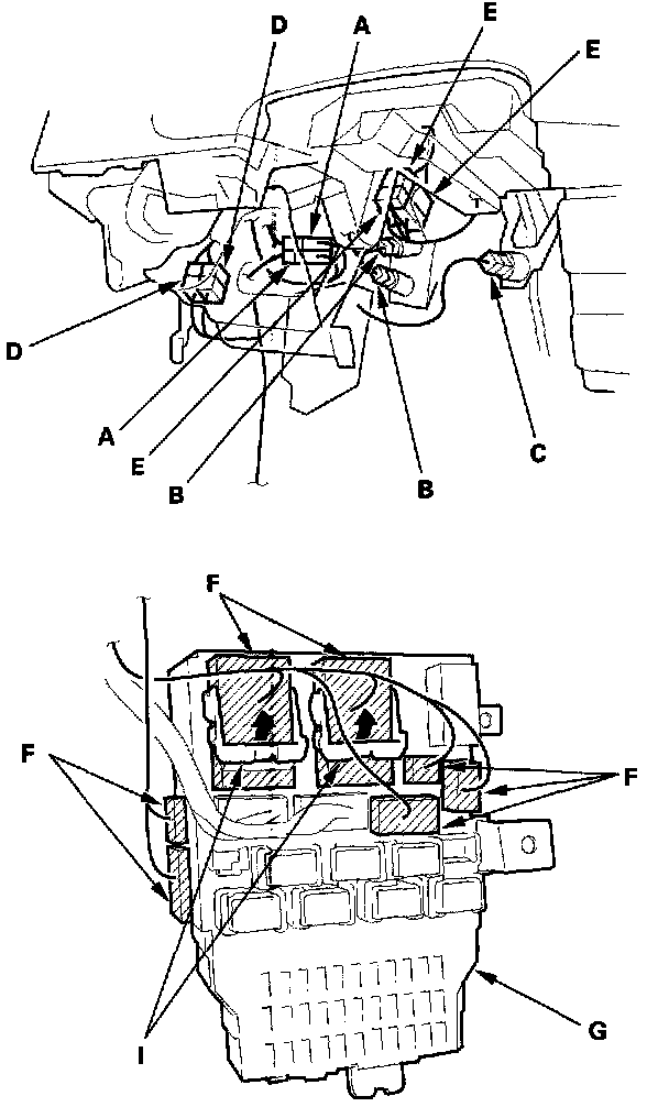 NOTE: Lift the white wire harness connector locks (I) before trying to remove the connectors from the fuse box.