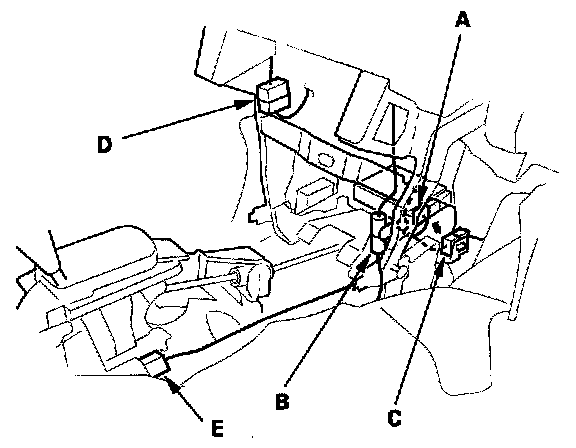 A/T models: Disconnect the shift lock solenoid connector (E).