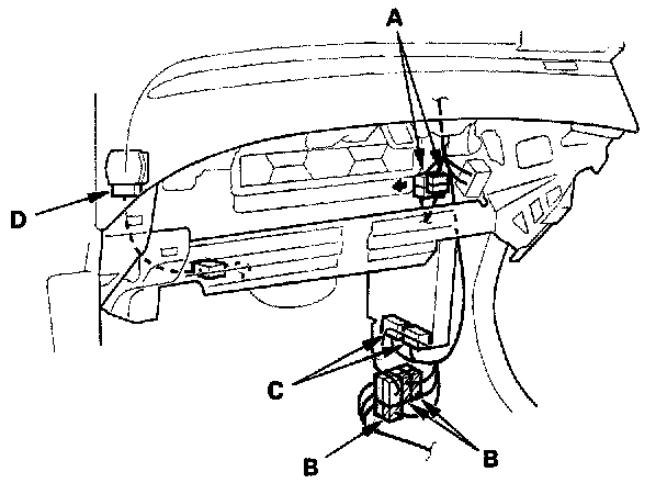 11. From under the dash, disconnect the ECM/PCM connector (A), antenna lead (B), engine wire harness connector (C) and NC subharness connector (D).
