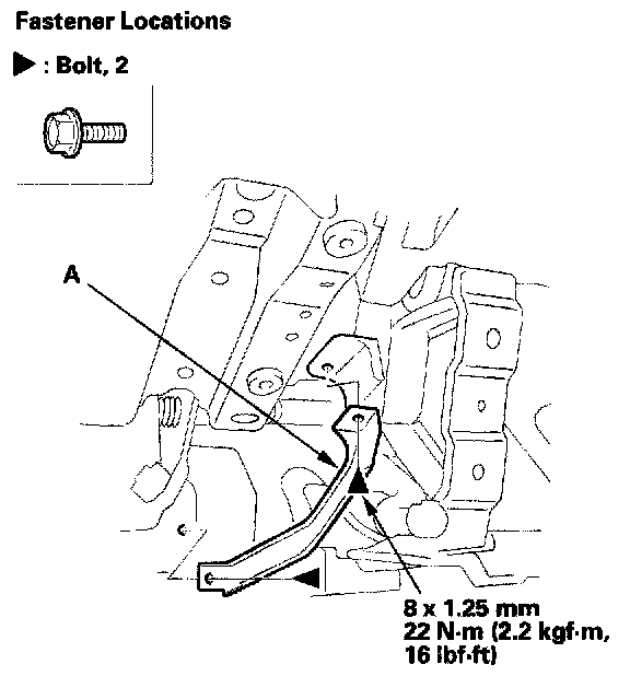 14. Remove bolts, then remove the brake pedal support member (A).