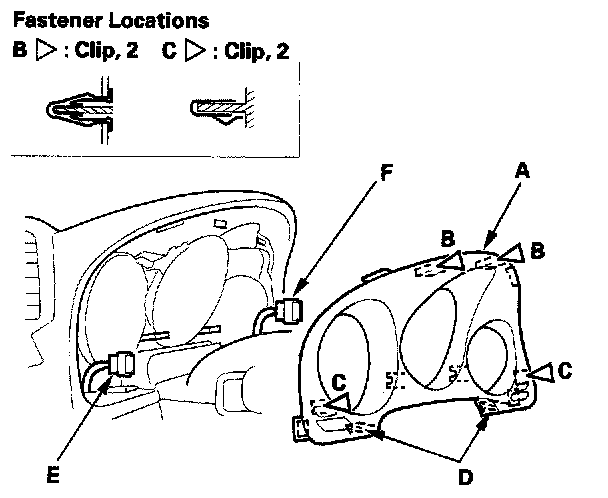 3. Disconnect the dash lights brightness controller connector (E) and the SELECT/RESET switch connector (F).
