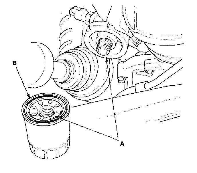 3. Inspect the threads (A) and rubber seal (B) on the new filter. Clean the seat on the engine block, then apply a light coat of new engine oil to the filter rubber seal, Use only filters with a built-in bypass system.