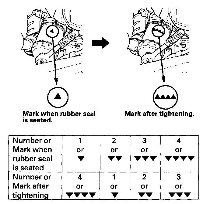 ^ Tighten the filter by turning it clockwise three numbers or marks from the one you noted. For example, if mark V is at the bottom when the seal is lightly seated, tighten the filter until the mark VVVV comes around to the bottom.