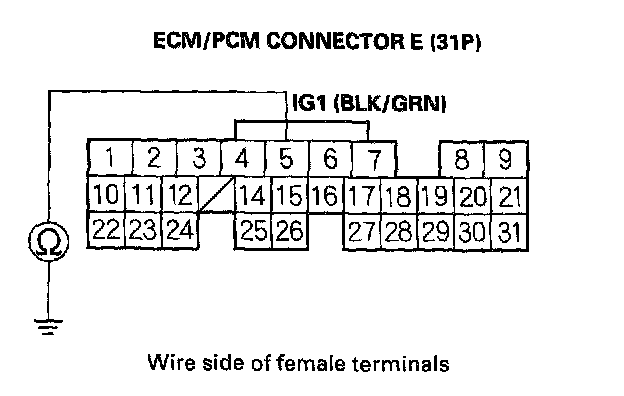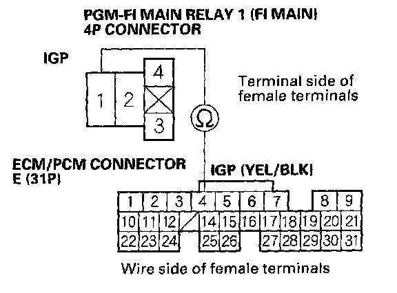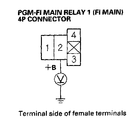 27. Check for continuity between body ground and PGM-FI main relay 1 (FI MAIN) 4P connector terminals No.2 and No.3 individually.