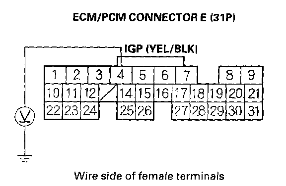 47. Measure voltage between ECM/PCM connector terminal E5 and body ground.
