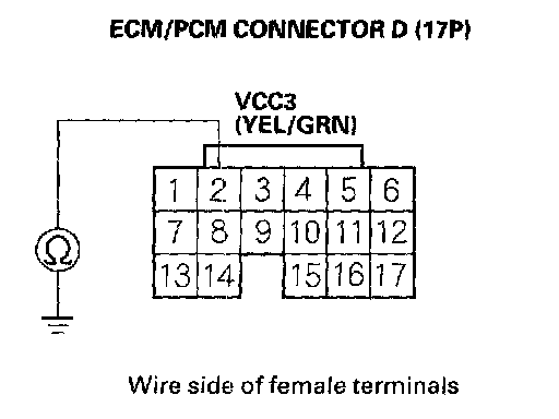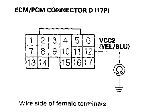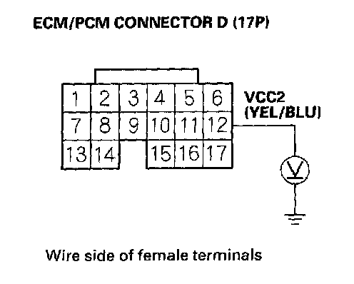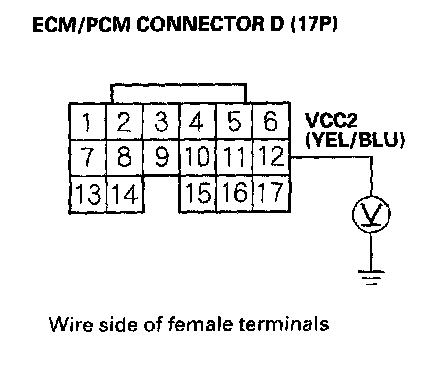 73. Disconnect the connector from each of these parts, one at a time, and measure voltage between ECM/PCM connector terminal D12 and body ground with the ignition switch ON (II).