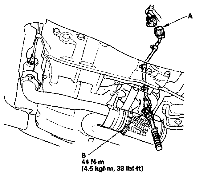 1. Disconnect the front secondary HO2S 4P connector (A), then remove the front secondary HO2S (B).