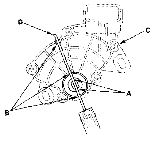 7. Align the cutouts (A) on the rotary-frame with the neutral positioning cutouts (B) on the transmission range switch (C) then put a 2.0 mm (0.08 inch) feeler gauge blade (D) in the cutouts to hold the switch in the N position.
