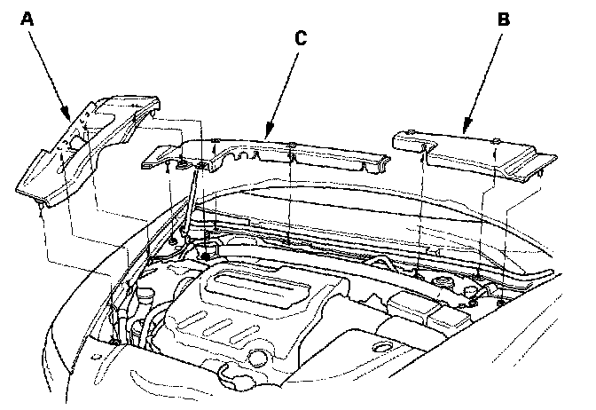 2. Remove the right side engine compartment cover (A), then remove the left rear engine compartment cover (B) and right rear engine compartment cover (C).