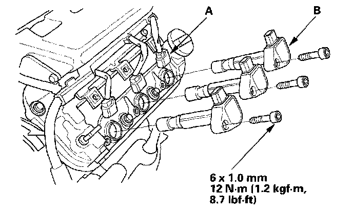 4. Disconnect the ignition coil connectors (A), then remove the ignition coils (B).