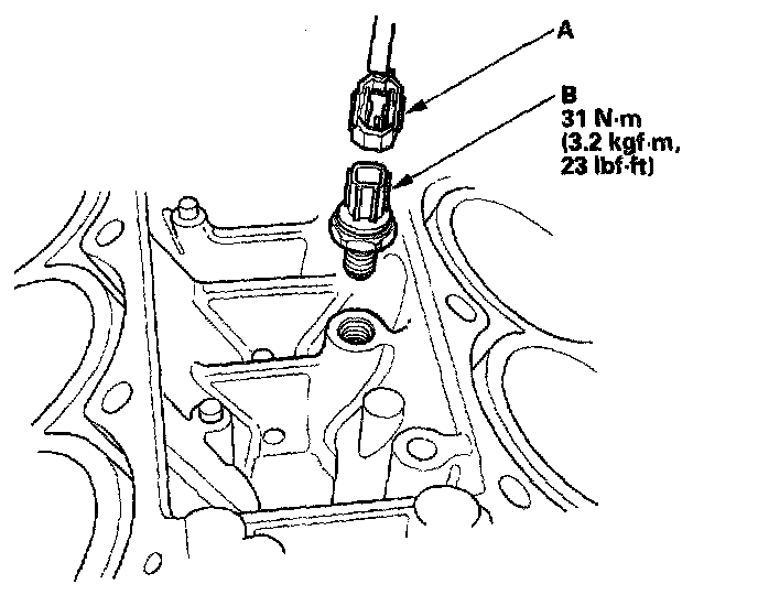 3. Disconnect the knock sensor connector (A), then remove the knock sensor (B).