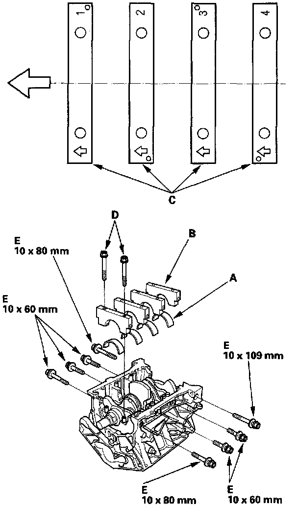 Apply engine oil to the bolt threads and flanges, then install the bearing cap bolts (D) and bearing cap side bolts (E).