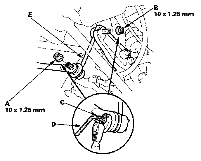 3. Remove the self-locking nut (A) and flange nut (B) while holding the respective joint pin (C) with a hex wrench (D), then remove the stabilizer link (E),