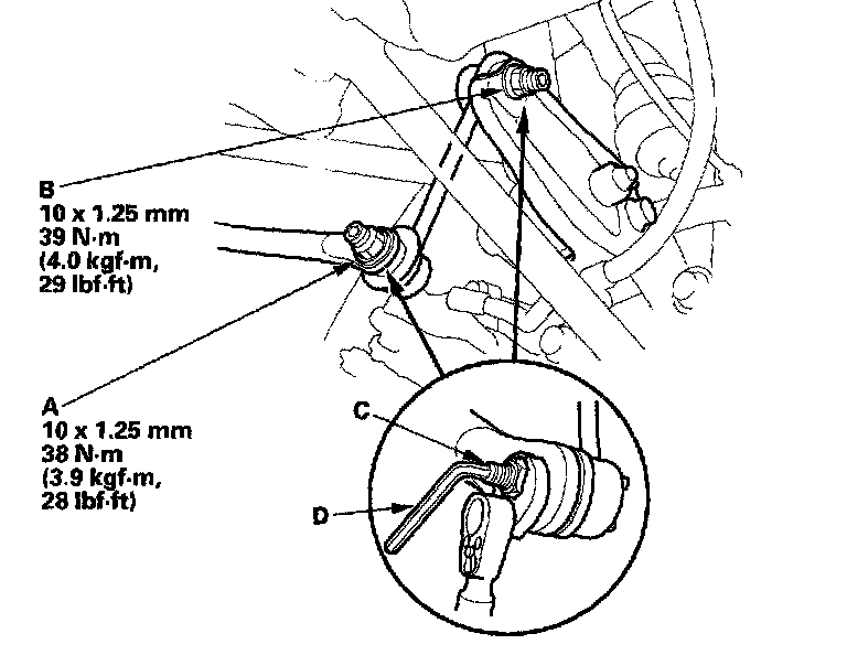 7. Tighten the self-locking nut (A) and flange nut (B) to the specified torque values while holding the respective joint pins (C) with a hex wrench (D).