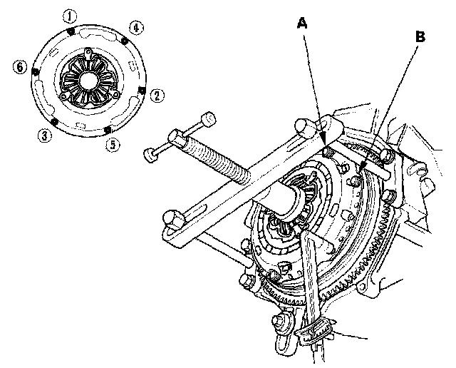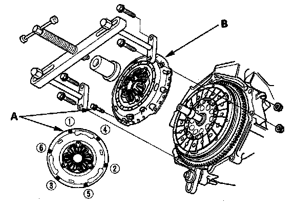 4. Loosen the pressure plate mounting bolts (A) in the pattern shown in several steps, then remove the bolts.