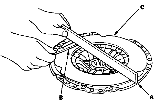 8. Inspect for warpage using a straight edge (A) and a feeler gauge (B). Measure across the pressure plate (C). If the warpage is more than the service limit, replace the pressure plate and clutch disc as a set.