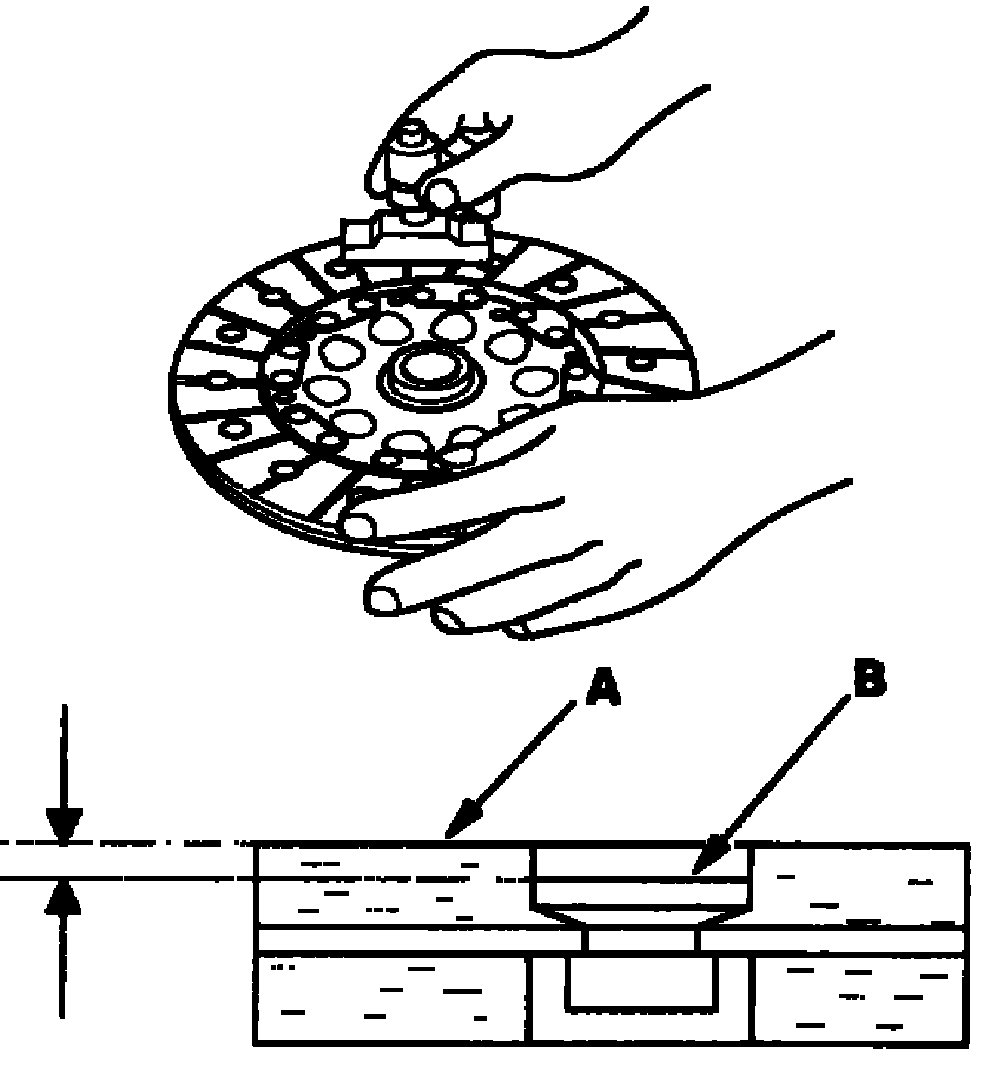 12. Measure the rivet depth from the clutch disc lining surface (A) to the rivets (B) on both sides. If the rivet depth is less than the service limit, replace the clutch disc and pressure plate as a set.