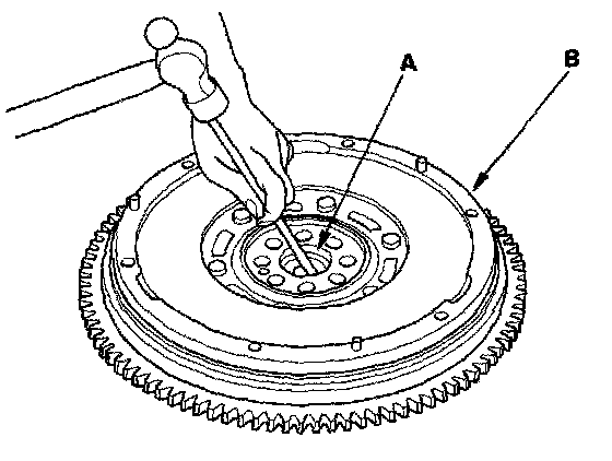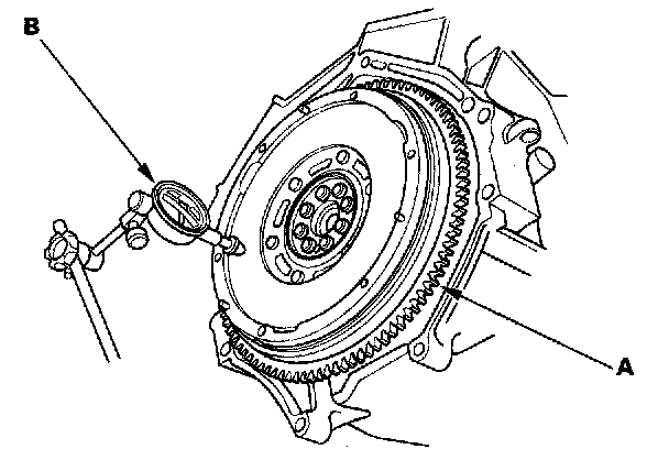 3. Measure the flywheel (A) runout using a dial indicator (B) through at least two full turns with the engine installed. Push against the flywheel each time you turn it to take up the crankshaft thrust washer clearance. If the runout is not within the standard, replace the flywheel, and recheck the runout. Resurfacing the flywheel is not recommended.
