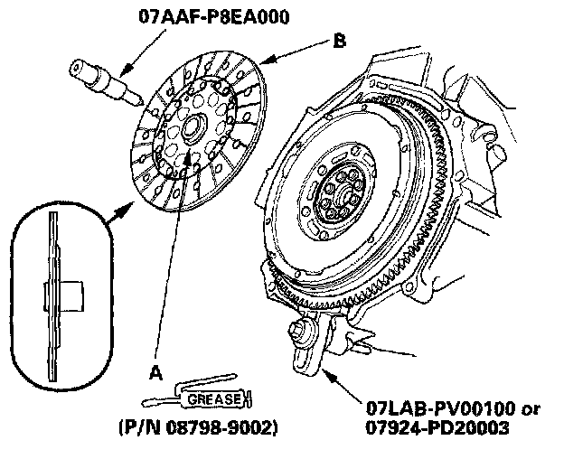 3. Apply super high temp urea grease (P/N 08798-9002) to the splines (A) of the clutch disc (B), then install the clutch disc using the special tools.