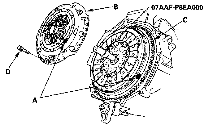 4. Align a point mark (A) across the pressure plate (B) and flywheel (C).