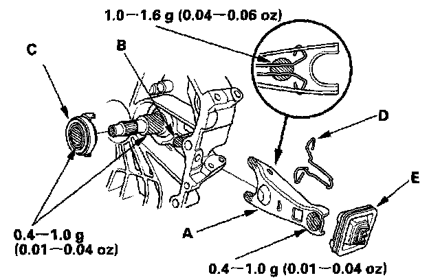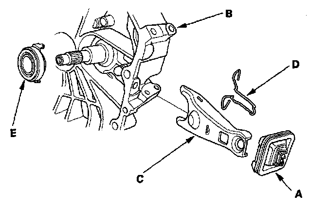 2. Remove the release fork (C) from the clutch housing by squeezing the release fork set spring (D). Remove the release bearing (E).