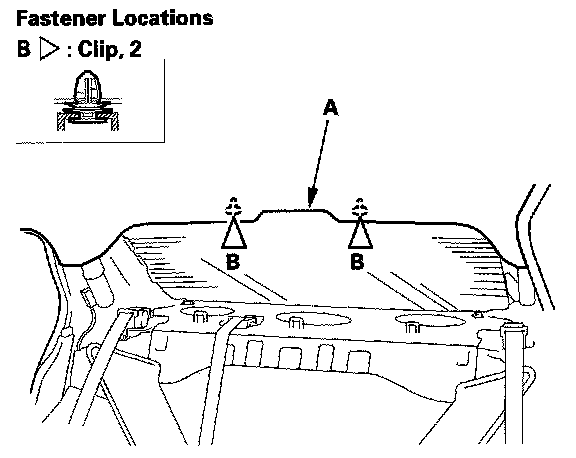4. Pull down the rear portion of the headliner (A) by detaching the clips (B). Take care not to bend the headliner excessively, or you may crease or break it.