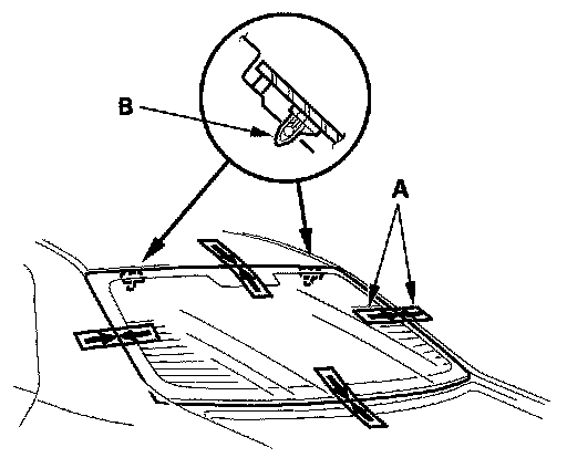 15. Set the rear window in the opening, and center it. Make alignment marks (A) across the rear window and body with a grease pencil at the four points shown. Make sure both upper clips (B) are in the body holes. Be careful not to touch the rear window where adhesive will be applied.