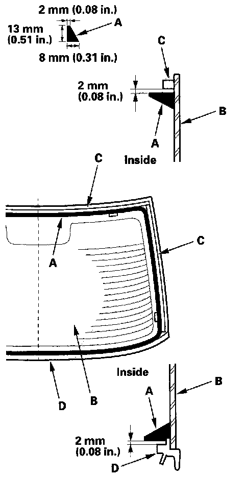 20. Put the cartridge in a caulking gun, and run a bead of adhesive (A) around the edge of the rear window (B) between the dams (C) and molding (D) as shown. Apply the adhesive within 30 minutes after applying the glass primer. Make a slightly thicker bead at each corner.