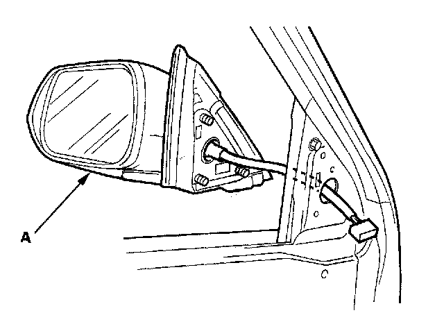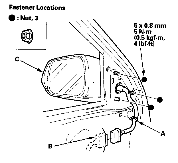 4. Remove the plastic cover as necessary, then detach the harness clip (A), and disconnect the connector (B). While holding the mirror (C), remove the nuts.