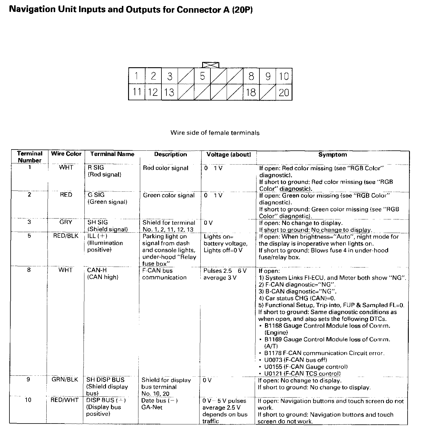 Navigation Unit Inputs And Outputs For Connector A (20P):