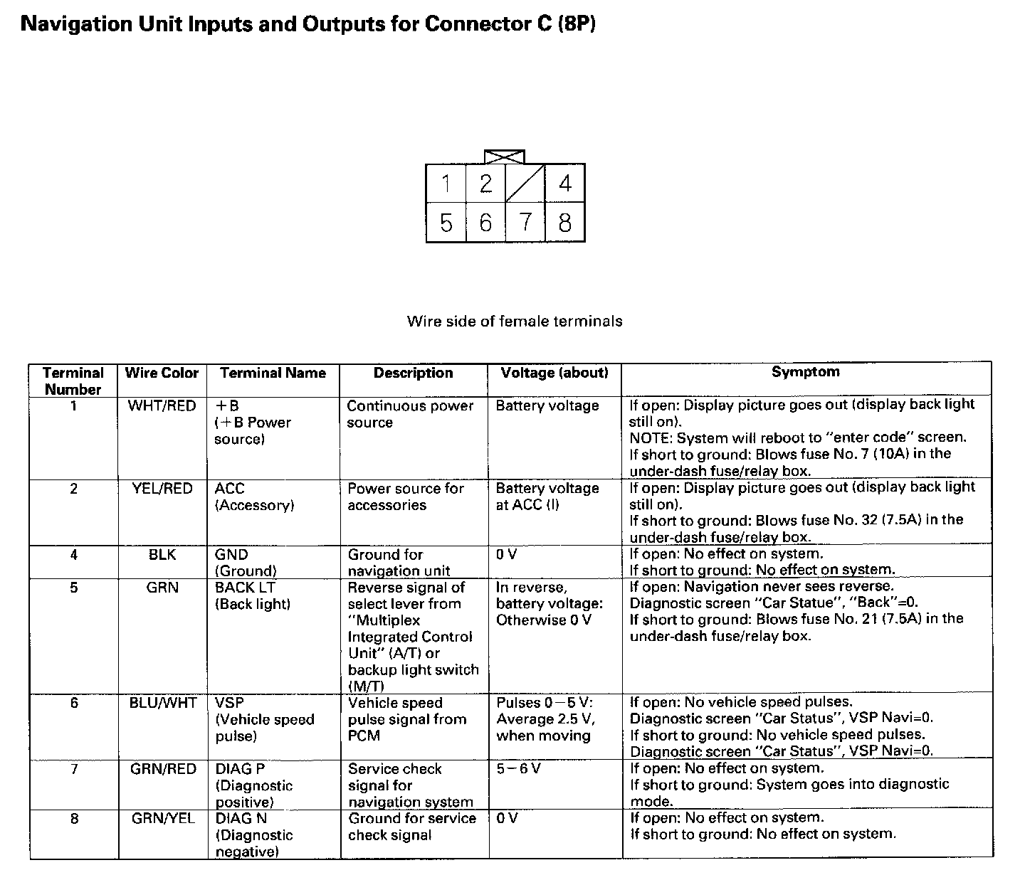 Navigation Unit Inputs And Outputs For Connector C (8P):