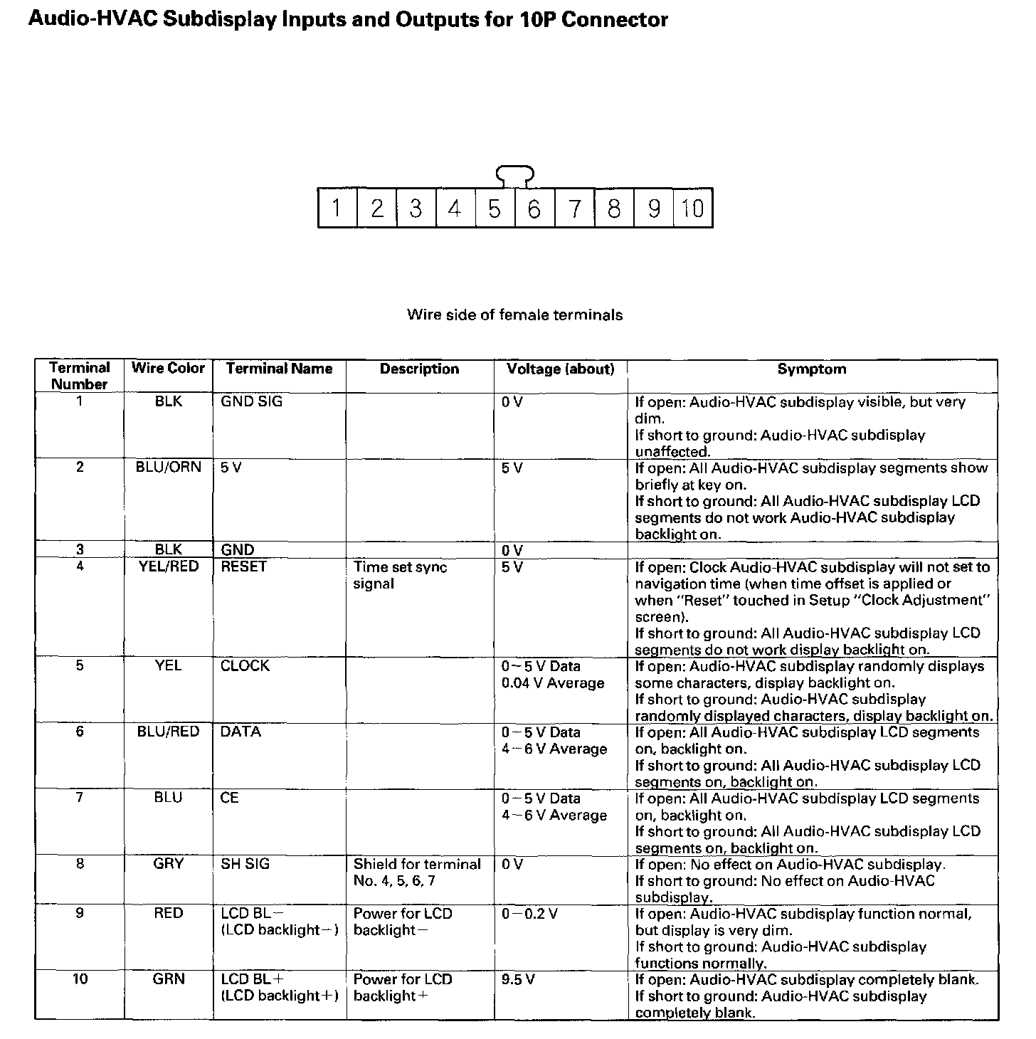 Audio-HVAC Subdisplay Inputs And Outputs For 10P Connector: