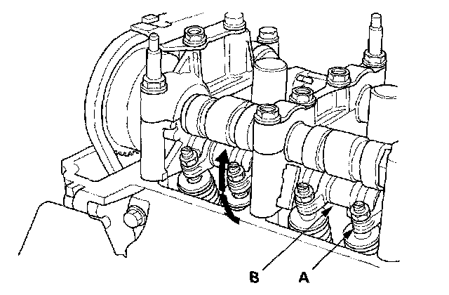 4. Move the secondary rocker arm (A) for No. 1 cylinder. The secondary rocker arm should move independently of the mid rocker arm (B).