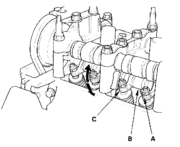 9. Remove the No. 2 and No. 3 camshaft holder bolts, and install the VTEC air adapters (C) finger-tight.