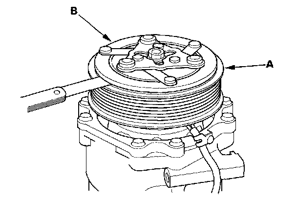 3. Measure the clearance between the rotor pulley (A) and the armature plate (B) all the way around. If the clearance is not within specified limits, remove the armature plate and add or remove shims as needed to increase or decrease clearance.