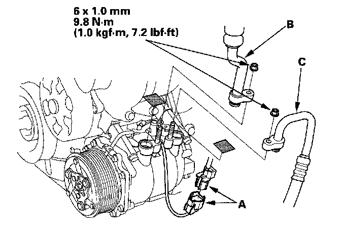 7. Disconnect the compressor clutch connector (A). Remove the nuts, then disconnect the suction line (B) and discharge line (C) from the compressor. Plug or cap the lines immediately after disconnecting them to avoid moisture and dust contamination.