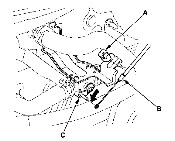 4. From under the hood, open the cable clamp (A), then disconnect the heater valve cable (B) from the heater valve arm (C). Turn the heater valve arm to the fully opened position as shown.