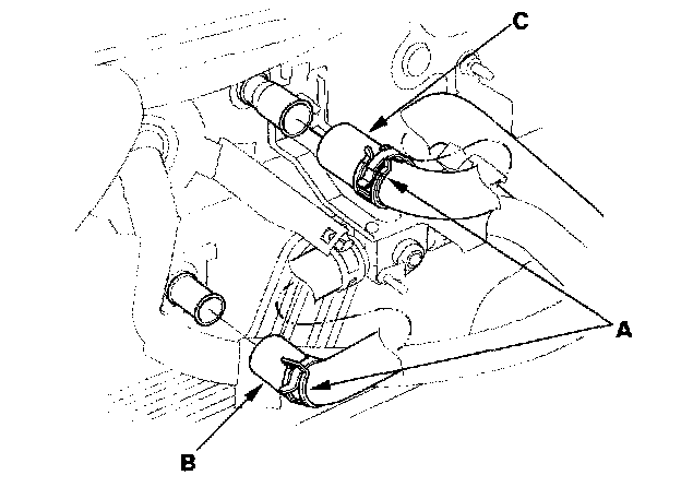 6. Slide the hose clamps (A) back Remove the bolt and water valve bracket, then disconnect the inlet heater hose (B) and the outlet heater hose (C) from the heater unit. Engine coolant will run out when the hoses are disconnected, drain it into a clean drip pan. Be sure not to let coolant spill on the electrical parts or the painted surfaces. If any coolant spills, rinse it off immediately.
