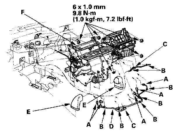 10. Disconnect the connectors (A) from the driver's air mix control motor, the evaporator temperature sensor, the power transistor the mode control motor, passenger's air mix control motor and the recirculation control motor then remove the wire harness clips (B), the connector clips (C) and the wire harness (D). Remove the heater ducts (E) then remove the mounting nuts and the blower heater unit(F).