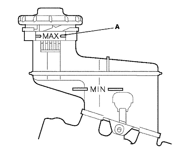 1. Make sure the brake fluid level in the reservoir is at the MAX (upper) level line (A).