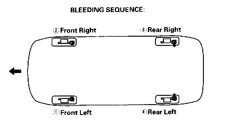 5. Repeat the procedure for each wheel in the sequence shown until air bubbles no longer appear in the fluid.