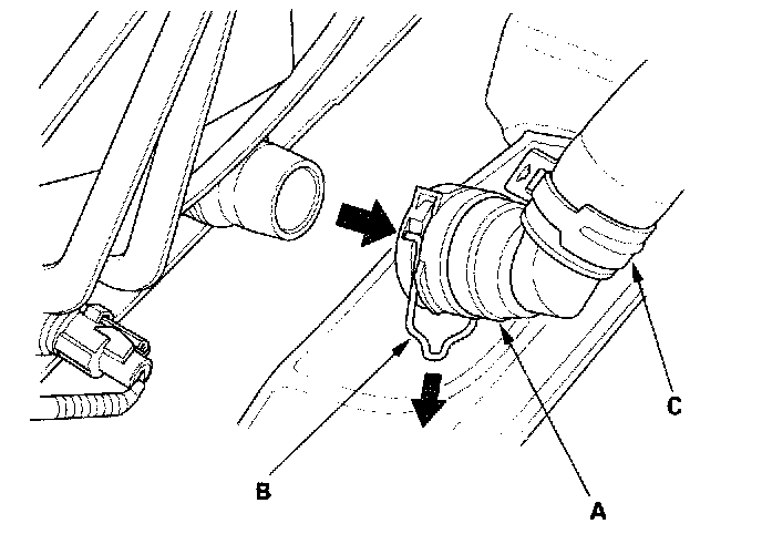 4. Remove the clamp (C) from both ends of the lower radiator hose and remove them from the thermostat and quick connector.