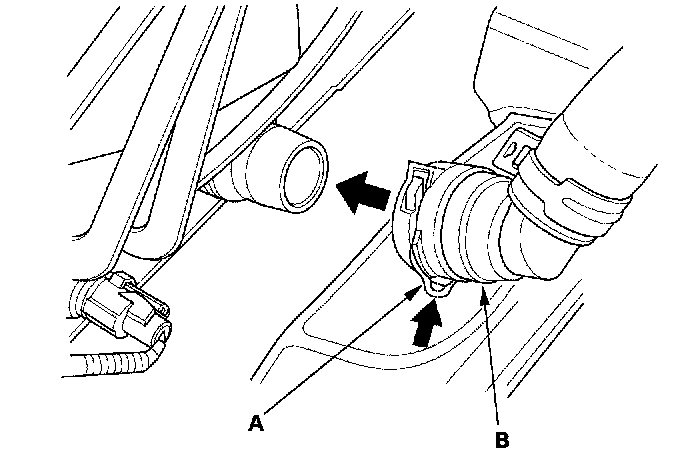 3. Pull out the lock (B) by hand, then wiggle the quick connector, and remove it from the radiator. Do not use any tools to remove the quick connector.