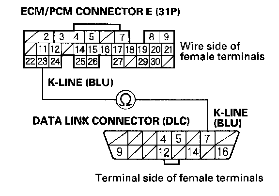 10. Check for continuity between DLC terminal No.7 and ECM/PCM terminal E23.