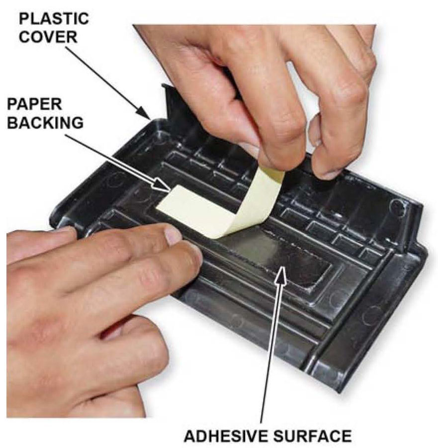 6. Peel off the paper backing from the tape on the plastic cover.