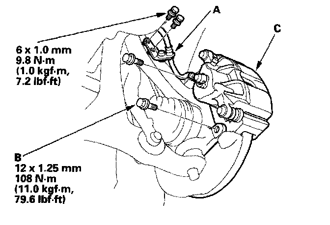 4. Remove the brake caliper bracket mounting bolts (B), and remove the caliper assembly (C) from the knuckle. To prevent damage to the caliper assembly or brake hose, use a short piece of wire to hang the caliper assembly from the undercarriage. Do not twist the brake hose with force.