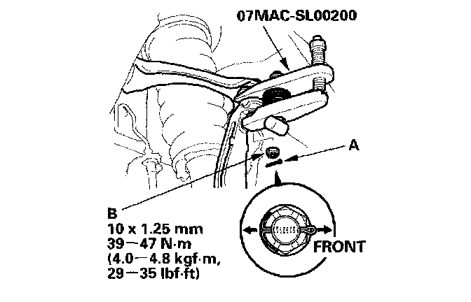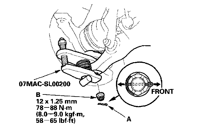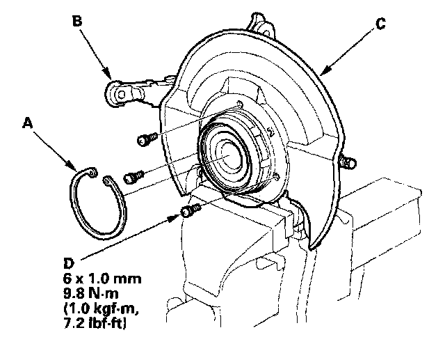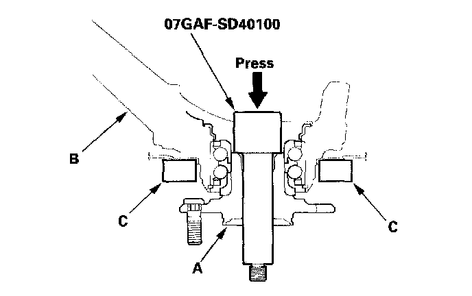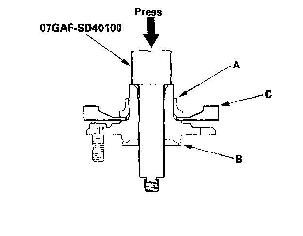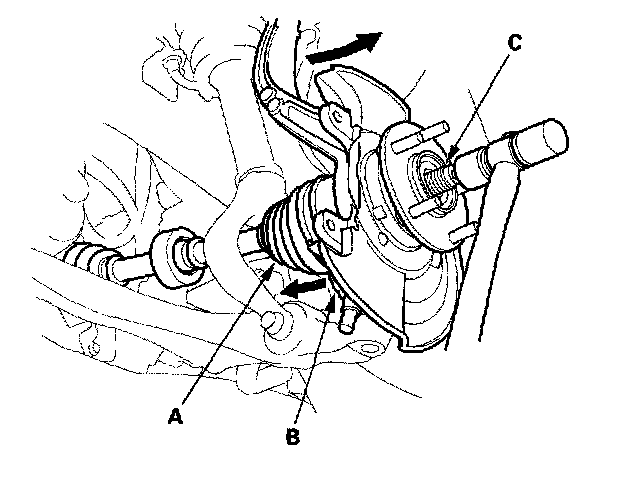 1. Separate the hub (A) from the knuckle (B) using the special tool and a hydraulic press. Hold the knuckle with the attachment (C) of the hydraulic press or equivalent tool. Be careful not to deform the splash guard. Hold onto the hub to keep it from falling when pressed clear.